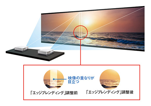 プロジェクターを複数台並べてマルチ画面表示をする際、つなぎ目の映像の重なりが目立たないように調整できます。