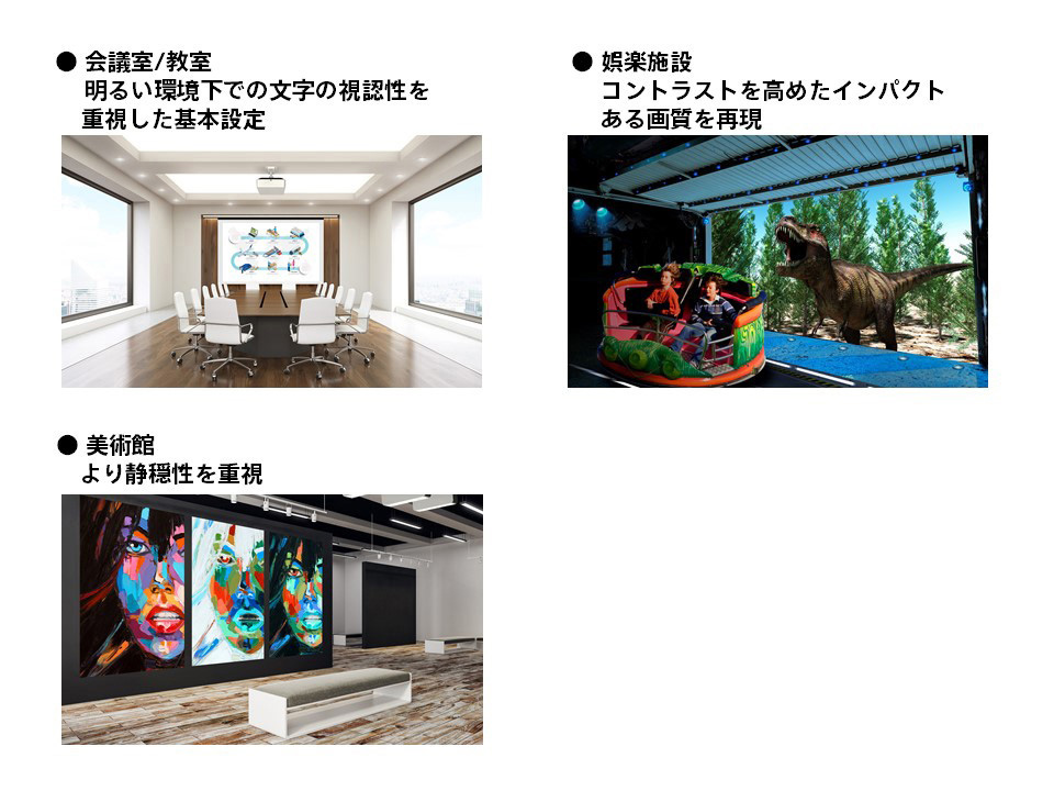 プリセットされた3つの「設置場所」から選ぶだけで、画質や光源出力レベル、冷却システムを自動的に調整し、使用環境に最適化された映像の投影を実現します。