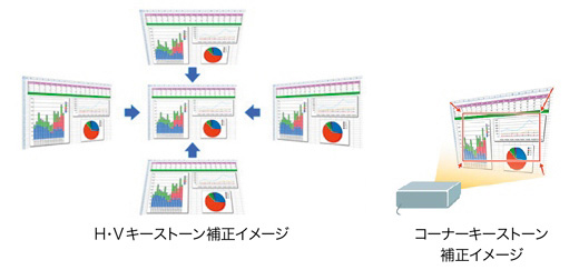H(左右方向)・V(上方向)のキーストーン補正に加え、コーナーキーストーン補正を搭載していますので、斜めからの投写や特殊スクリーンへの投写も可能です。