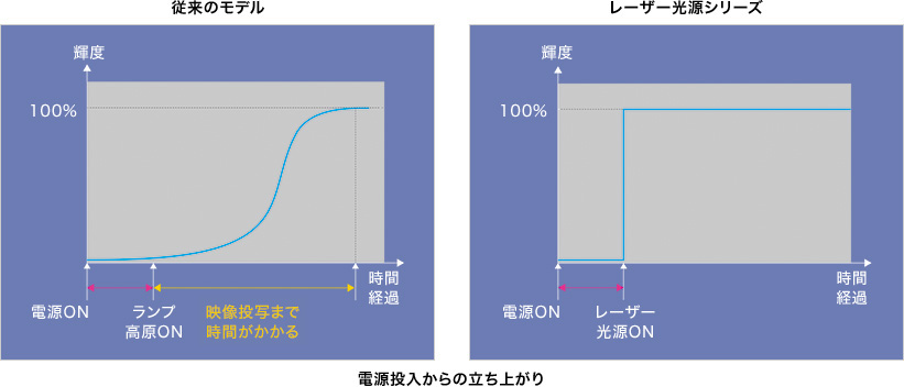 従来のランプ式プロジェクターでは、電源を入れてから点灯し明るさが安定するまで1分近くお待ちいただくのが当たり前でした。その間、どうしても、会議や授業の進行が止まってしまう不便がありました。