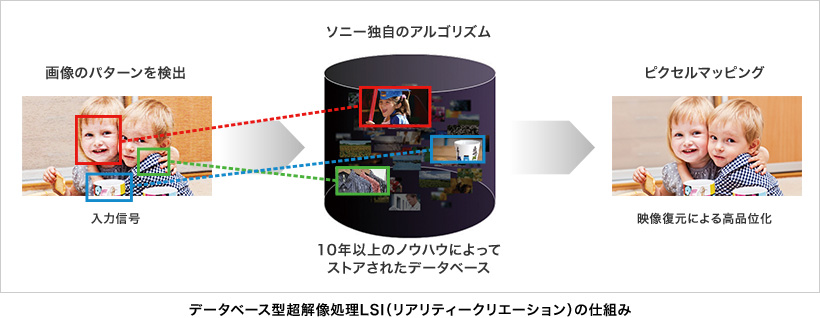 ソニーのレーザー光源プロジェクターは、ホームシアタープロジェクターに採用されているものと同じ「データベース型超解像処理LSI(リアリティクリエーション)」を搭載しています。入力された映像ソースをリアルタイムで映像パターンの解析をし、数千パターンに分類。データベース上に存在する最適な画像(絵柄)と照合し、オリジナルの映像信号がもっていた質感やディテール感、さらに、映像データの編集や伝送で失われてしまった情報までも復元します。同時に、映像特有のさまざまなノイズも大幅に低減し、本来の映像素材がもつ鮮鋭感や美しさを忠実に再現します。