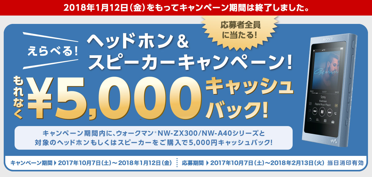 キャッシュバック対象となるのは、ウォークマン®1台に対して、ヘッドホンもしくはワイヤレススピーカー1台のみです。