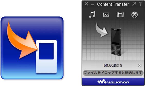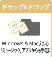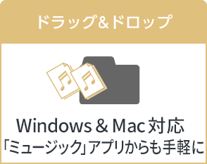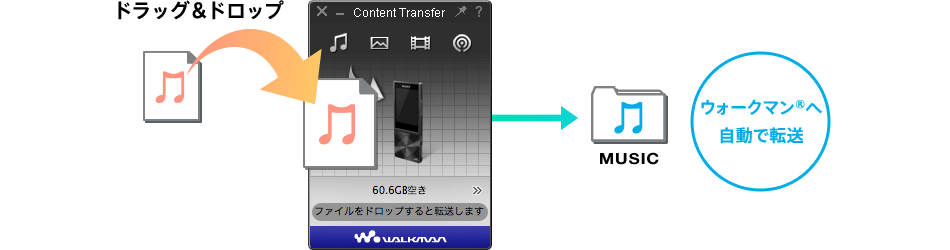 PC内の音楽を「Content Transfer for Mac」へドラッグ&ドロップすると、ウォークマン®へ転送してくれます。「iTunes」や「ミュージック」アプリの場合は、ミュージックライブラリ画面からのドラッグ&ドロップで転送が可能です。