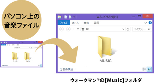 ウォークマン®とパソコンを接続した後に、音楽ファイルをウォークマン®の[Music]フォルダへドラッグ&ドロップするだけで、楽曲を入れることができます。フォルダは8階層まで作成できるので、楽曲の管理もかんたんです。