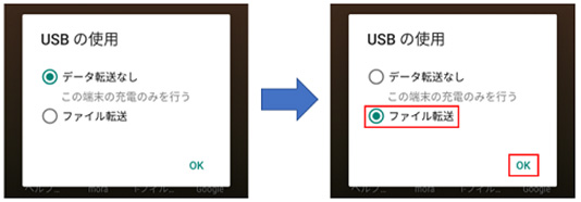 ウォークマンの画面に[USB の使用]メニューが表示されたら、[ファイル転送]を選択し、[OK]をタップ