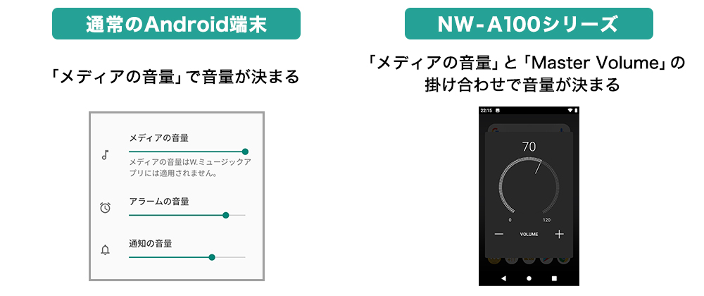 通常のAndroid端末は「メディアの音量」で、段階的にしか音量を調節できないのに対し、「Master Volume」というボリュームの仕組みを採用することで、120段階で音量調節が可能に。