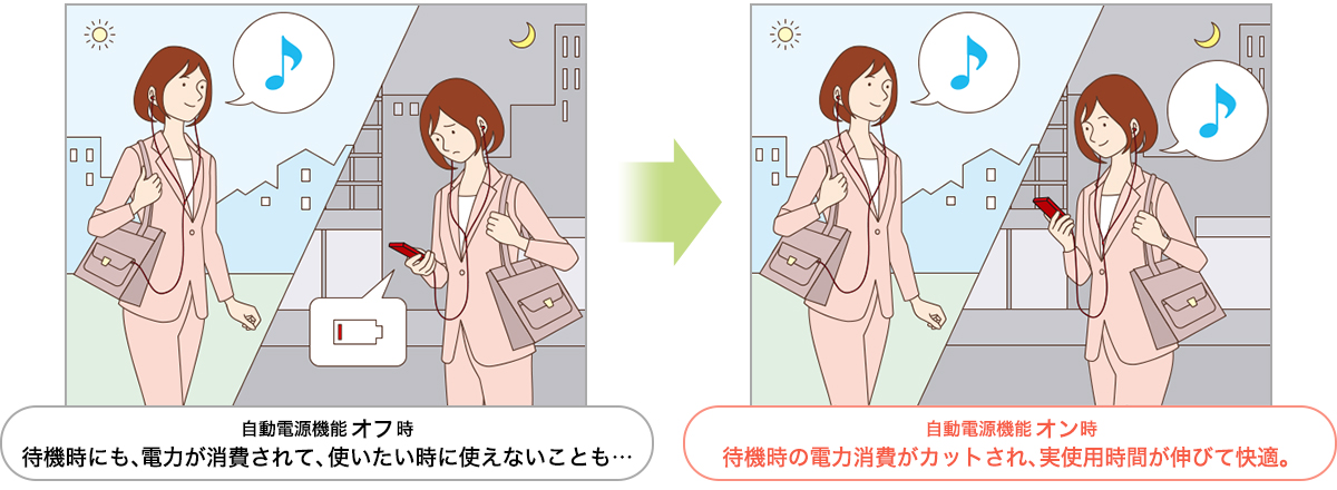 ウォークマンの音楽再生を止めてから、一定時間経過すると、自動的に電源を落とす機能です。この機能をオンにすることにより、利用していない時に消費されていた待機時の消費電力をカットすることができ、実使用の電池持続時間が大きく改善されます。
