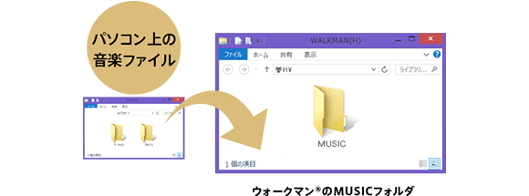 * ドラッグ&ドロップ転送をした著作権保護された音楽ファイル(音楽ダウンロードサイト「mora」(モーラ)などからダウンロード購入した楽曲)は再生することはできません。また、プレイリストの転送はできません