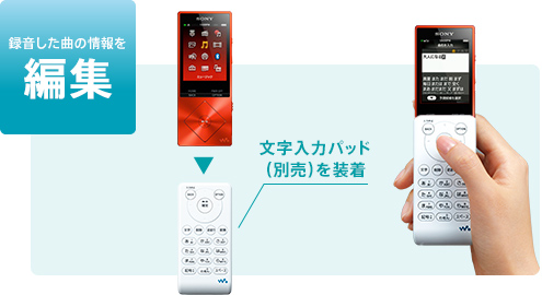 別売の文字入力パッド KPD-NWU10をウォークマンに装着。携帯電話でメールを打つ感覚で、曲名やアーティスト名などをスムーズに入力できます。