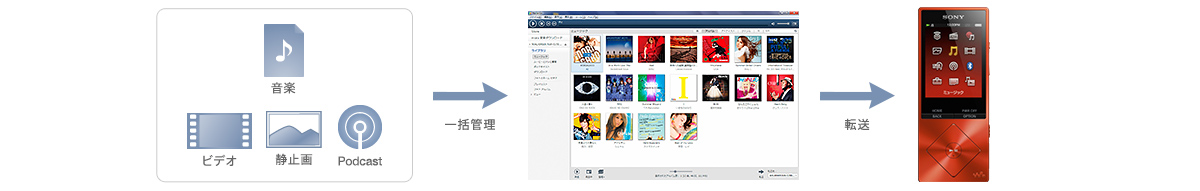 「Media Go」はPC内の音楽やビデオ、写真、ポッドキャストなどをまとめて管理できるPCアプリケーション。各コンテンツの取り込み/再生/ウォークマンへの転送を一括して行えます。ウォークマンに加え、Xperia(TM)、Xperia(TM)Tablet、PSP(R)などさまざまなソニー機器へのコンテンツ転送に対応。「Media Go」ならお持ちの複数の機器のファイルを一元管理できます。