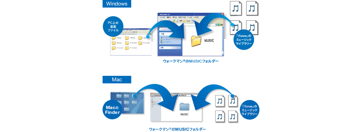 簡単転送アプリケーション「Content Transfer for Mac」に対応。Mac上の音楽・ビデオ・写真を「Content Transfer for Mac」へドラッグ&ドロップすれば、ウォークマンの最適なフォルダに自動で振り分けて転送できます。また、「iTunes」のミュージックライブラリー画面からもドラッグ&ドロップが可能です。