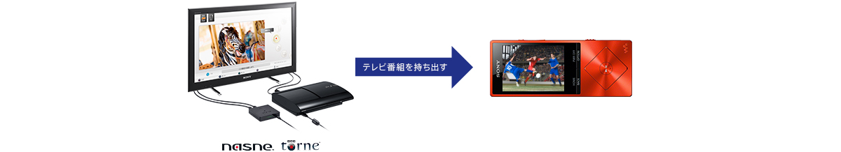 torne(トルネ)(TM) やnasne(ナスネ)(TM)からウォークマンへビデオの書き出しが可能です(*)。お気に入りの番組をウォークマンで持ち出して、外出時や通勤・通学時などに楽しめます。