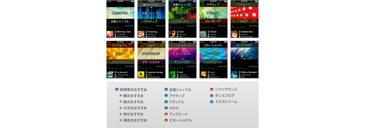 アクティブ / エモーショナル / ソファラウンジ / ダンスフロア / エクストリーム / アップビート / リラックス / メロウ / 朝のおすすめ / 昼のおすすめ / 夕方のおすすめ / 夜のおすすめ / 深夜のおすすめ / 全曲シャッフル