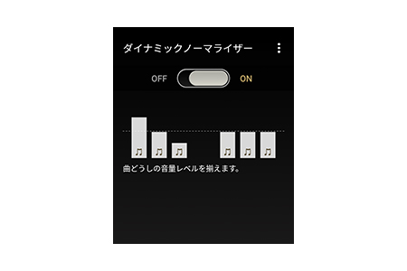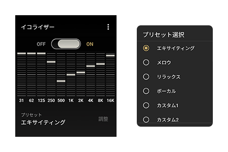 音源に応じて多彩なイコライザーから音質を選んで音楽を楽しめます。ブライト、エキサイティング、メロウ、リラックス、ボーカルの5種類に加えて、お好みの音質を細かく設定できるカスタムイコライザーを2種類保存可能です。カスタムでは、スライダー操作で大きく、+/-ボタンでは細かく調整できるので、自分好みの音質にスムーズに調整できます。