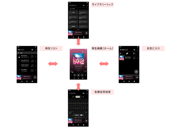 音楽再生画面を中心に上下左右にスライドすることで、各メニュー(ライブラリートップ/各種音質設定/再生リスト/お気に入り)に素早くアクセス可能。目的の曲をスムーズに検索でき、音質調整を手軽に楽しめます。WALKMAN(R)ならではの音楽再生に特化したUIを引き継ぎつつ、さらに使いやすく進化しました。