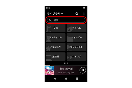 ライブラリートップの「検索キーワード入力BOX」に、キーワードを入力すると、曲/アルバム/アーティストから該当するものを検索できます。聴きたい楽曲がすぐに見つかり、とても便利です。
