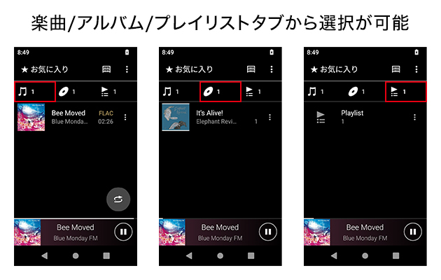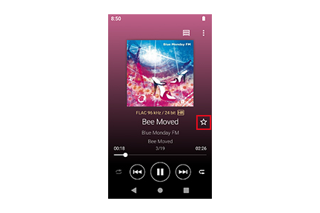 W.ミュージックアプリ内のお好みの楽曲を「お気に入り」に登録できます。登録した楽曲は、「お気に入り」に保存され、「お気に入り」画面では楽曲/アルバム/プレイリストタブから聴きたい楽曲を選択できます。かんたんに素早く再生したい楽曲を見つけることが可能に。