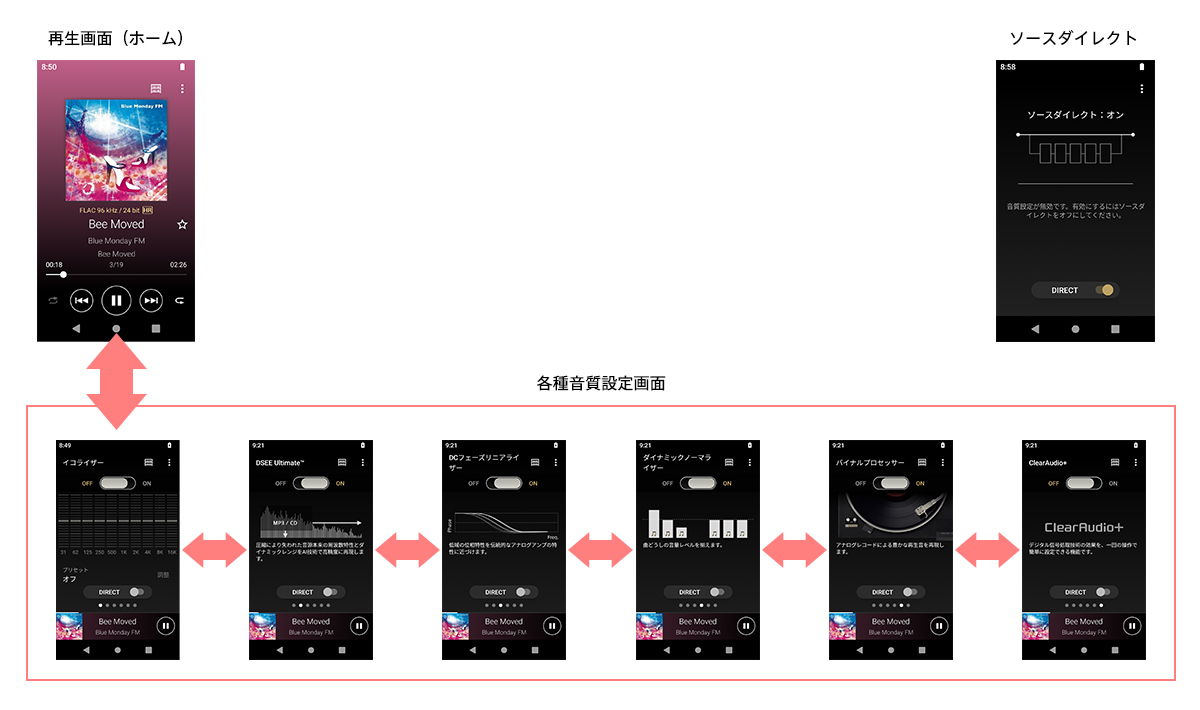 音楽を聴くときのホームポジションである「再生画面」から「各種音質設定画面」に、上方向への1フリックでアクセス可能。また、すべての音質設定を無効にしてダイレクトな音を再生するソースダイレクト機能も搭載しています。ソースダイレクトON/OFFの分かりやすさ、スキュアモーフィックデザインによる設定のしやすさなど、音質設定時の操作性も向上しました。