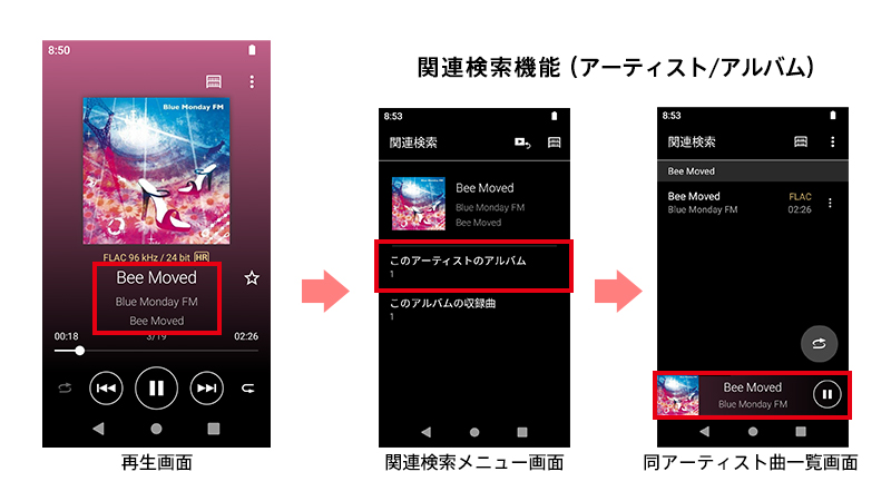 再生画面の曲名の部分をタップすると、再生中の曲のアルバムから収録曲を探す「アルバム関連検索」と、再生中の曲のアーティストからアルバムを探す「アーティスト関連検索」を利用できます。関連する楽曲をすぐに見つけられて便利です。