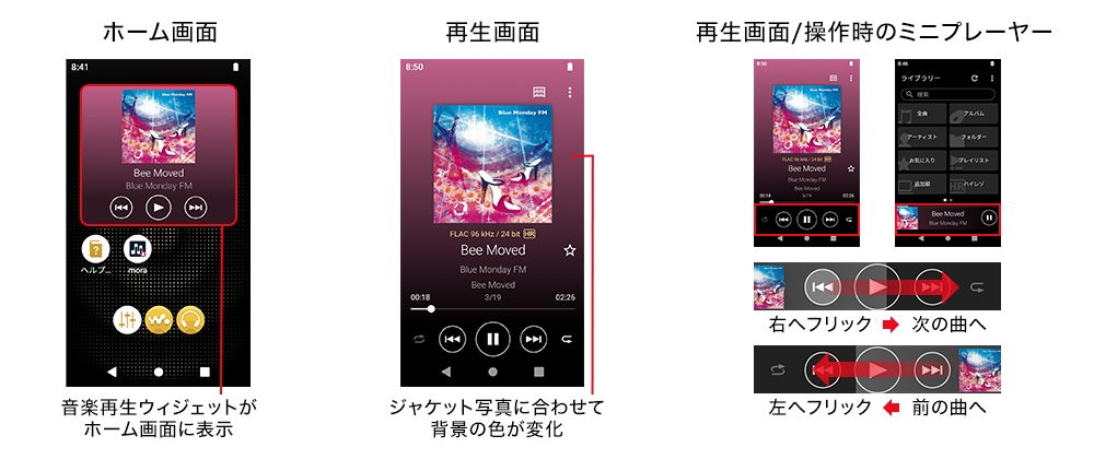 音楽再生中、ホーム画面に音楽再生ウィジェットが表示。再生画面では、ジャケット写真に合わせて背景の色が変わる新しいUIもお楽しみいただけます。再生画面/操作時のミニプレーヤーは、タップだけではなくフリック操作も可能に。右/左にフリック操作することで次の曲/前の曲へ。音楽再生に特化した高い操作性とデザイン性により、上質な音楽体験をお届けします。