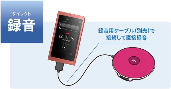 CDプレーヤーなどのオーディオ機器とウォークマンを別売の録音用ケーブル(WMC-NWR1)で接続。シンクロ録音を選択すれば、曲の再生開始にあわせて自動で録音がスタート。曲が終了すれば自動で録音もストップするので、とてもかんたんです。