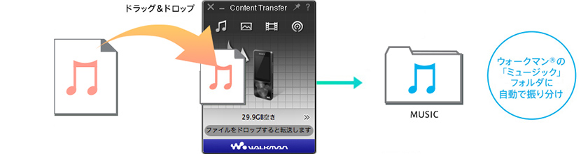 *1 ドラッグ&ドロップ転送をした著作権保護された音楽ファイル(音楽ダウンロードサイト「mora」(モーラ)などからダウンロード購入した楽曲)は再生することはできません。また、プレイリストの転送はできません