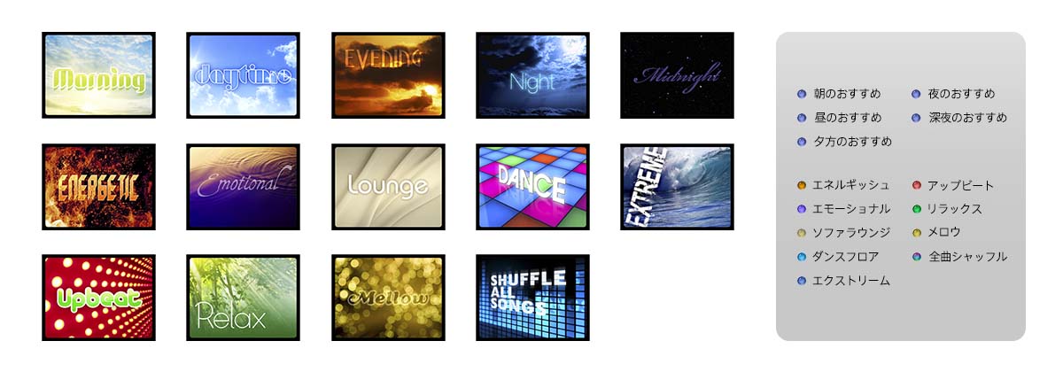 エネルギッシュ/エモーショナル/ソファラウンジ/ダンスフロア/エクストリーム/アップビート/リラックス/メロウ/朝のおすすめ/昼のおすすめ/夕方のおすすめ/夜のおすすめ/深夜のおすすめ/全曲シャッフル