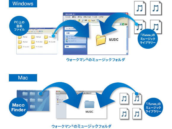 *1 ドラッグ&ドロップ転送をした著作権保護された音楽ファイル(音楽ダウンロードサイト「mora」(モーラ)などからダウンロード購入した楽曲)は再生することはできません。また、プレイリストの転送はできません