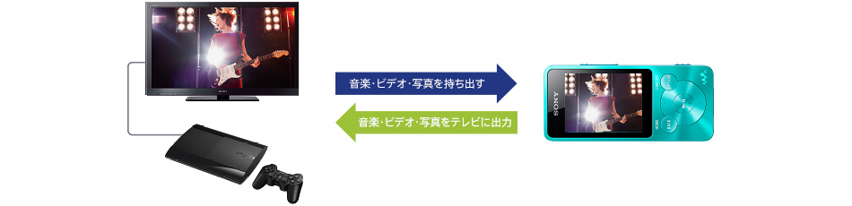 PlayStation(R)3 のHDD に貯めた音楽・ビデオ・写真をウォークマンへ転送して再生できます(*)。また、ウォークマンに保存してある音楽・ビデオ・写真を、PlayStation(R)3 経由でテレビに出力して大画面で楽しめます。
