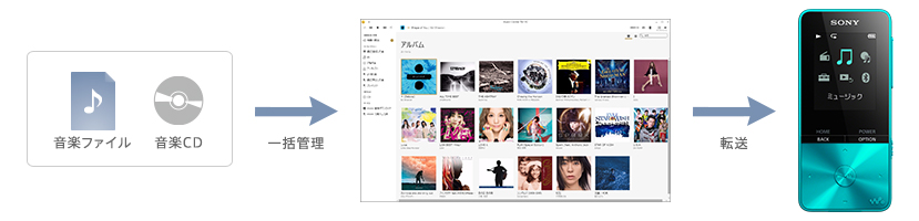 「Music Center for PC」は、PC内の音楽コンテンツをまとめて管理できるWindows向けPCアプリケーション。各コンテンツの取りこみ/再生/ウォークマンへの転送を一括して行え、ハイレゾ音源の取りこみやPC上での再生も可能です。