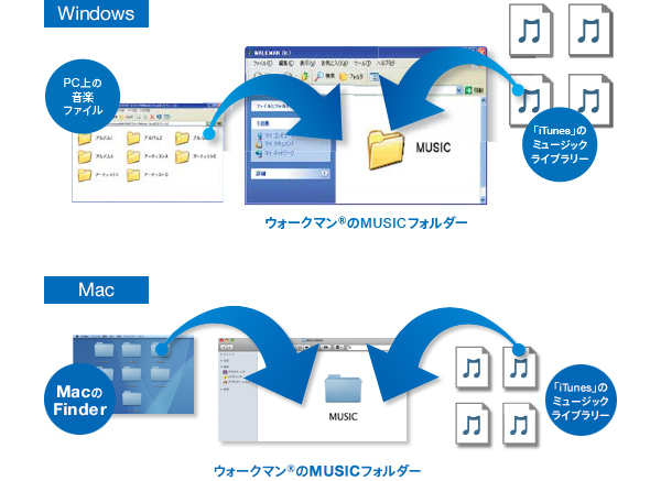 Mac OS向けPCアプリケーション「Content Transfer for Mac」に対応。Mac上の音楽コンテンツをドラッグ&ドロップすれば、ウォークマンの最適なフォルダに自動で振り分けて転送できます。また、「iTunes」のミュージックライブラリー画面からもドラッグ&ドロップで音楽コンテンツの転送が可能です。