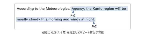 語学コンテンツや曲内の任意の地点(A-B間)を指定してのリピート再生が可能。集中して学習したい箇所を繰り返し聴けます。