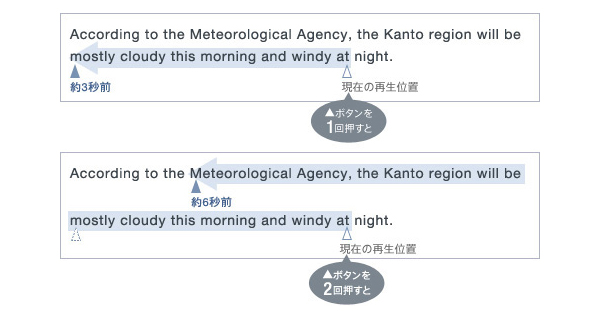 再生中に▲ボタンを押すと、約3秒再生位置を戻せます。A-Bリピート再生との併用も可能で、効果的な学習をサポートします。