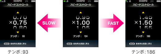 ダンス練習時に便利な「再生スピードコントロール」と「A-Bリピート再生」機能を手軽に切り替えられるダンスモードを搭載。また、12音解析技術により曲のテンポを表示できるので、練習目的にあわせて再生スピードを調節できます(*)。