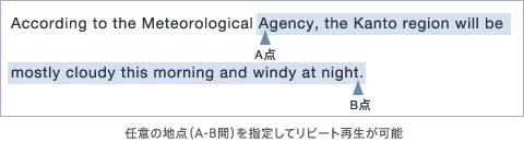 語学コンテンツや曲内の任意の地点(A-B間)を指定してのリピート再生が可能。集中して学習したい箇所を繰り返し聴けます。