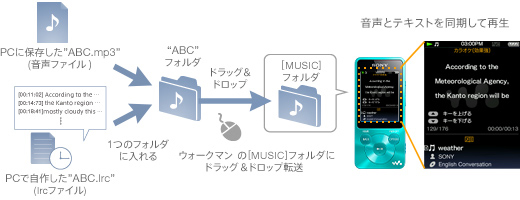 lrcファイルに対応しているので、自分で作成したlrcファイルを使って、ウォークマン画面上で音声とテキストを同期して再生可能。例えば、語学コンテンツに合わせたファイルを作成すれば、語学をスマートに学べます。操作は、lrcファイルを作成し、作成したlrcファイルと音声ファイルをウォークマンのMusicフォルダにドラッグ&ドロップ転送するだけ。