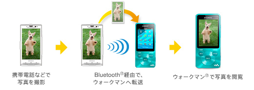 ウォークマン同士はもちろん、携帯電話やスマートフォンともワイヤレスでファイルの送受信が可能(*)。携帯電話で撮った写真をウォークマンに転送して、ウォークマンで閲覧したり、壁紙に設定したりできます。