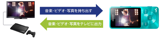 PlayStation(R)3 のHDD に貯めた音楽・ビデオ・写真をウォークマンへ転送して再生できます(*)。また、ウォークマンに保存してある音楽・ビデオ・写真を、PlayStation(R)3 経由でテレビに出力して大画面で楽しめます。