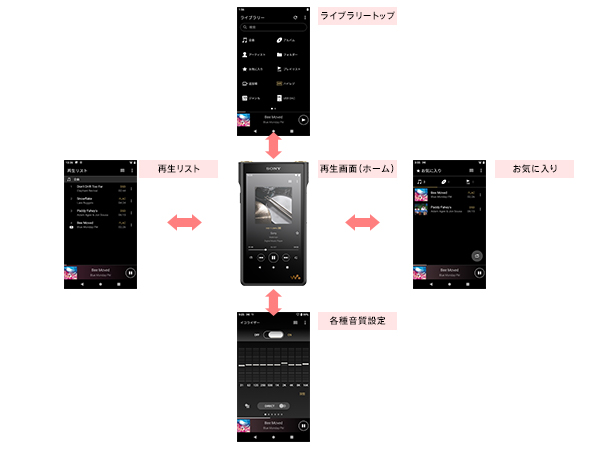 音楽再生画面を中心に上下左右にスライドすることで、各メニュー(ライブラリートップ/各種音質設定/再生リスト/お気に入り)に素早くアクセス可能。目的の曲をスムーズに検索でき、音質調整を手軽に楽しめます。