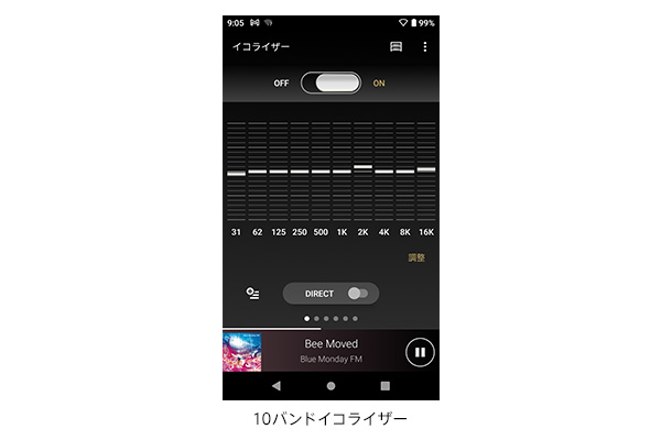 お持ちのヘッドホンの特性等に合わせて微調整が可能な「10バンドイコライザー」を搭載。スライダー操作で大きく、+/-ボタンでは細かく調整できるので、自分好みの音質にスムーズに調整できます。