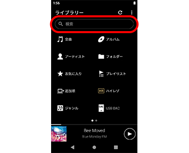 ライブラリートップの「検索キーワード入力BOX」に、キーワードを入力すると、曲/アルバム/アーティストから該当するものを検索できます。聴きたい楽曲がすぐに見つかり、とても便利です。