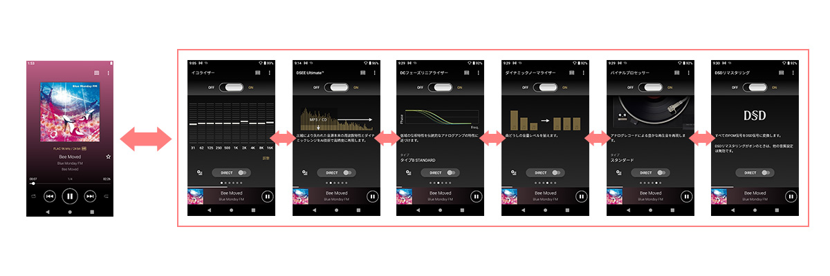音楽を聴くときのホームポジションである「再生画面」から「各種音質設定画面」に、1フリックでアクセス可能。また、すべての音質設定を無効にしてダイレクトな音を再生するソースダイレクト機能も搭載しています。
