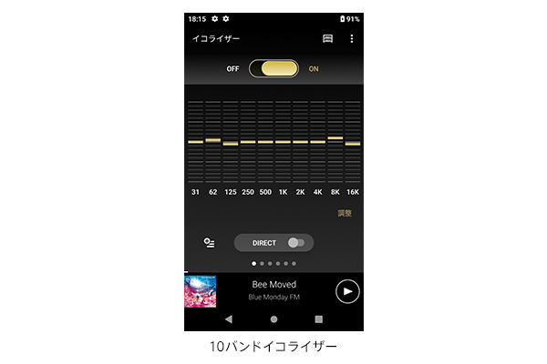 お持ちのヘッドホンの特性等に合わせて微調整が可能な「10バンドイコライザー」を搭載。スライダー操作で大きく、+/-ボタンでは細かく調整できるので、自分好みの音質にスムーズに調整できます。