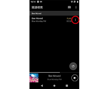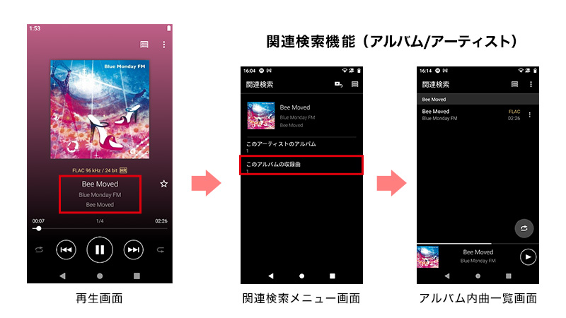 再生画面の曲名の部分をタップすると、再生中の曲のアルバムから収録曲を探す「アルバム関連検索」と、再生中の曲のアーティストからアルバムを探す「アーティスト関連検索」を利用できます。関連する楽曲をすぐに見つけられて便利です。