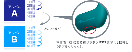 楽曲再生中に右本体の曲送りボタンを素早く2回押し(ダブルクリック)すると、次のアルバムやフォルダの1曲目に移動します。聴きたい曲をスピーディーに探したいときなどに便利です。また、プレイリストを本体に保存しておけば、プレイリストの再生もできます。