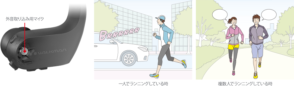 * 外音取り込み機能は周囲の音を聞き取りやすくする機能ですが、すべての音を聞き取れるようにする機能ではありません。音楽のボリュームを大きくした場合や周囲の状況によっては、外音が聞こえなくなることがあります