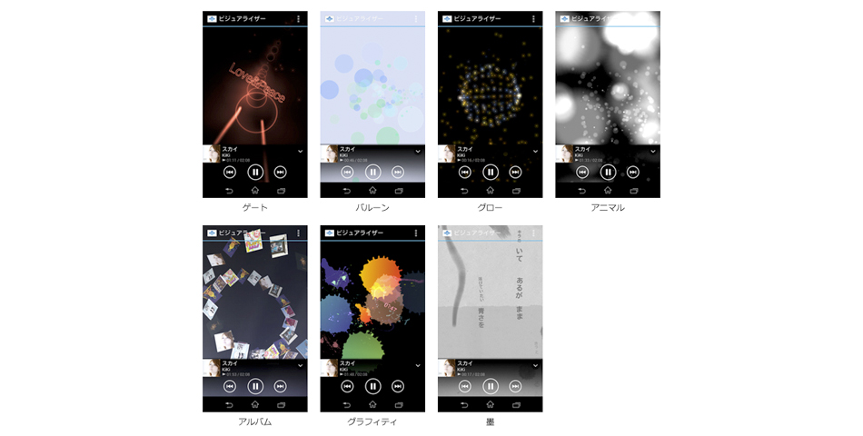 楽曲のメロディやリズム、音の高・低などに合わせて、さまざまなイメージで画面を彩るビジュアライザーを搭載。耳だけでなく目でも音楽を楽しめます。