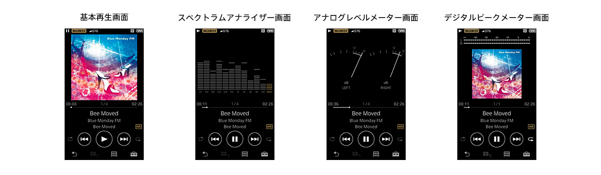 ジャケット写真をメインにした通常の「音楽再生画面」の他に、”音の見える化”をテーマにした高レスポンス・高解像度な「スペクトラムアナライザー画面」と、懐かしい針の動きで躍動感を演出する「アナログレベルメーター画面」、シンプルにオーディオ機器らしさを演出する「デジタルピークメーター画面」を用意。好みや気分に合わせて4種類の再生画面から選べます。