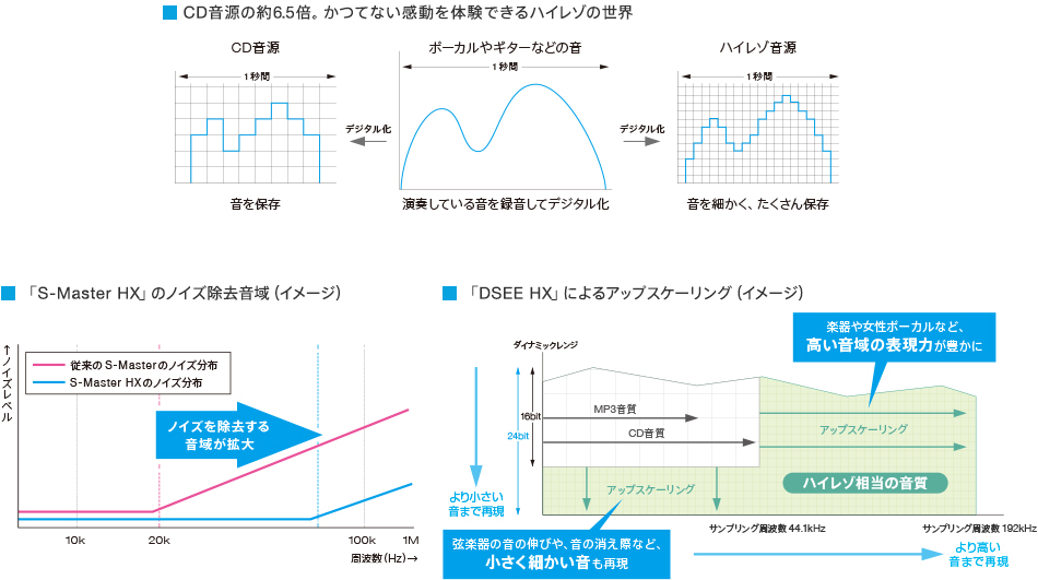 音の情報量がCDの約6.5倍(*1)あるハイレゾ音源に対応。高音域再生におけるノイズ除去性能を高めたフルデジタルアンプ「S-Master HX」(*2)を搭載し、繊細な空気感や臨場感あふれる、きめ細やかなサウンドを体感できます。また、MP3などの圧縮音源やCD音源をハイレゾ相当の高解像度音源にアップスケーリング(*3)する「DSEE HX」(*4)を搭載。いつも聴いている楽曲がハイクオリティーに生まれ変わります。
