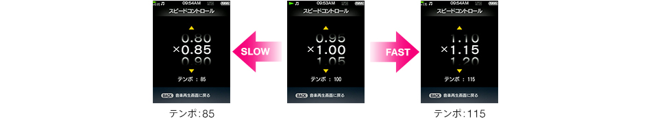 ダンス練習時に便利な「再生スピードコントロール」と「A-Bリピート再生」機能を手軽に切り替えられるダンスモードを搭載。また、12音解析技術により曲のテンポを表示できるので、練習目的にあわせて再生スピードを調節できます(*)。